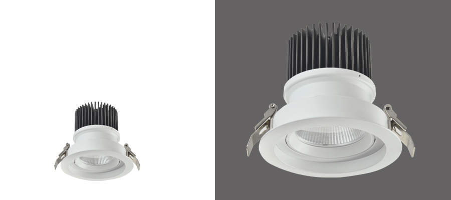 LED Down light luminaire with die-cast Aluminum alloy in white powder coating finish.